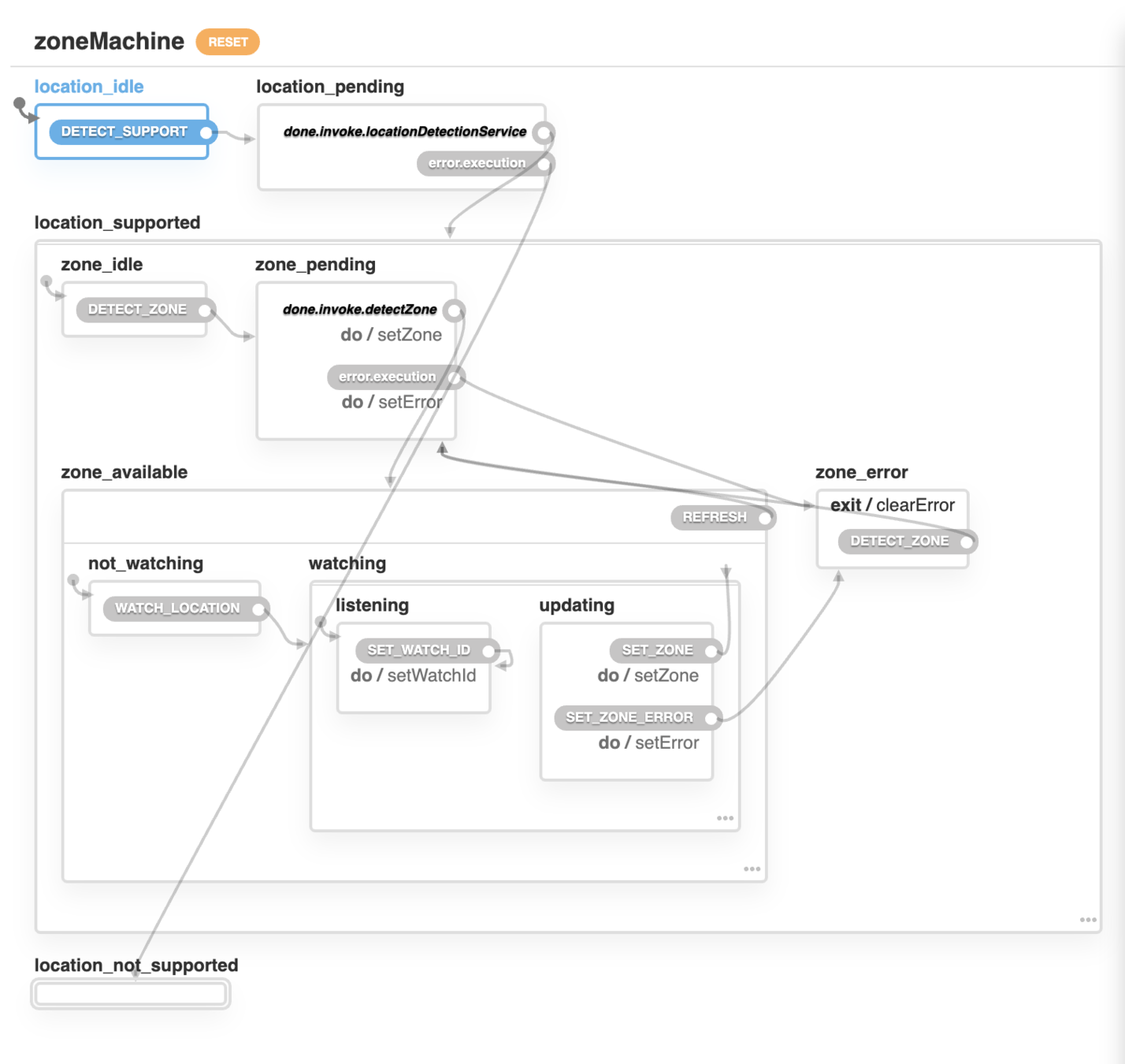 type State = | { type: "location_pending" } | { type: "location_supported.zone_idle" } | { type: "location_supported.zone_pending" } | { type: "location_supported.zone_error"; error: string } | { type: "location_supported.zone_available.not_watching"; zone: Zone } | { type: "location_supported.zone_available.watching.listening"; zone: Zone; watchId: number; } | { type: "location_supported.zone_available.watching.updating"; zone: Zone; watchId: number; };